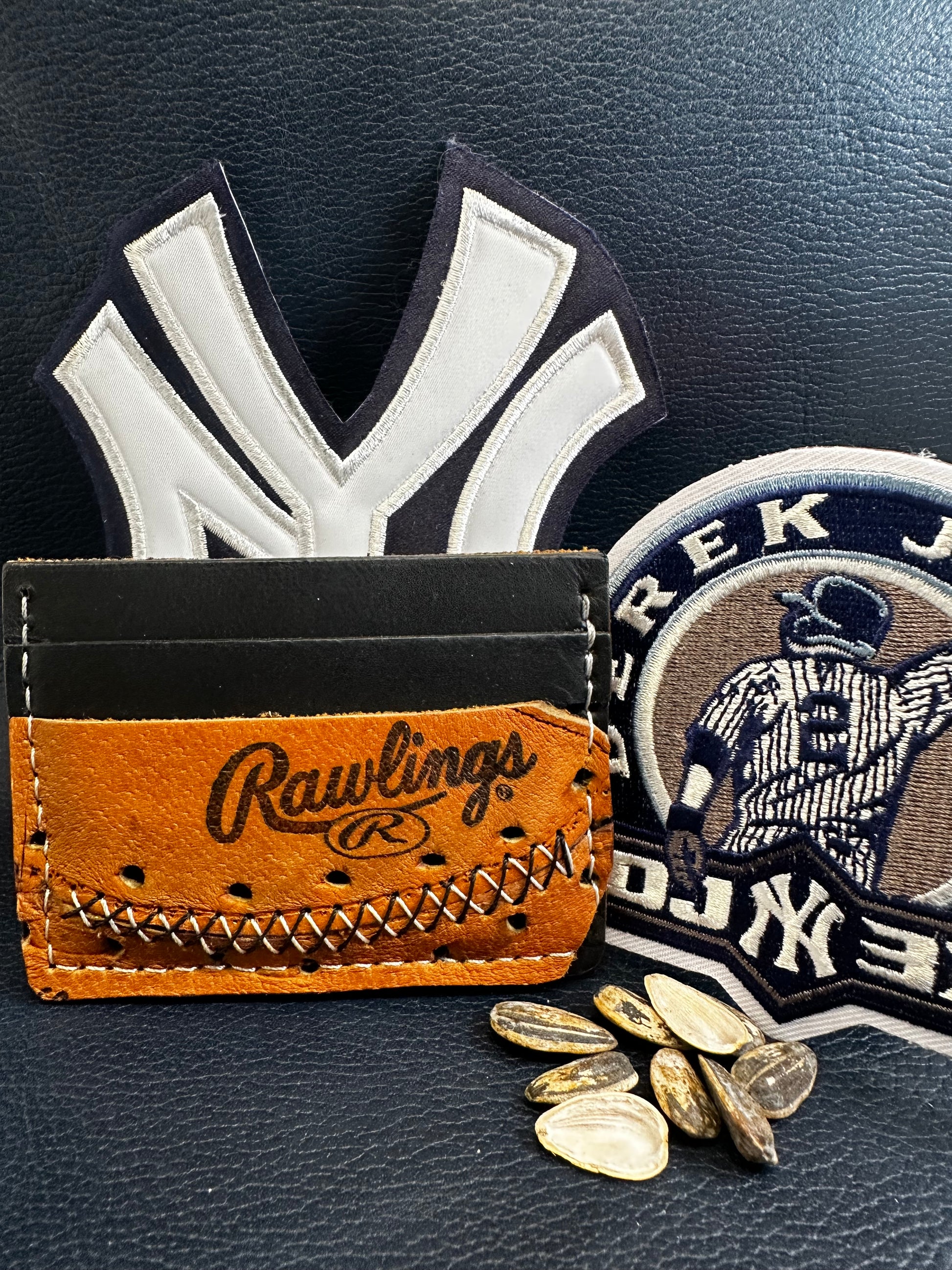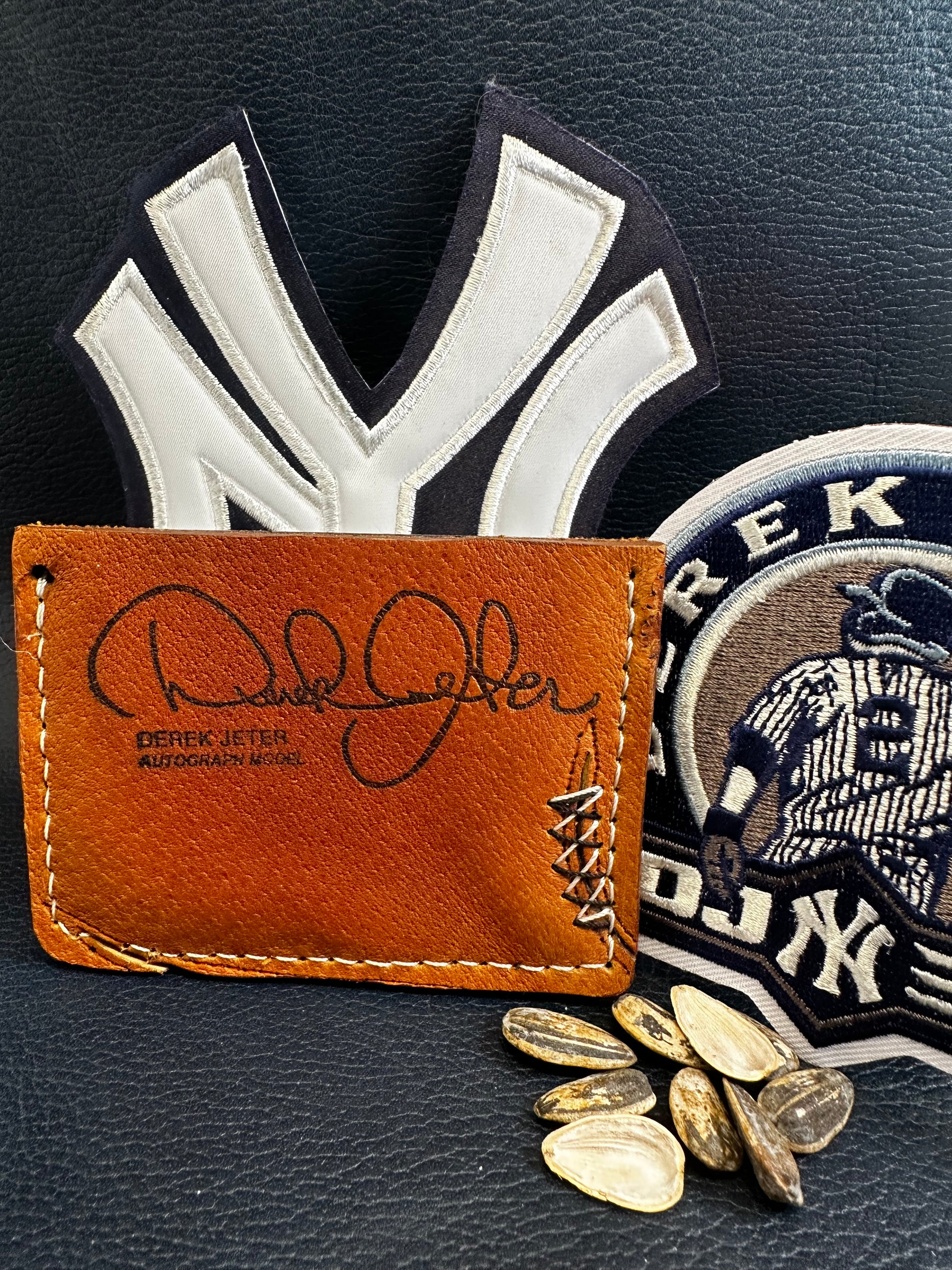 Step up to the plate with the Jeter - Captain, a pre-loved baseball glove that's been given a stylish makeover into a card holder. This authentic mitt features eye-catching two-toned custom stitching that sets it apart from the rest, blending vintage character with personalized flair. Perfect for players who want to make a statement while honoring the legacy of one of baseball's greatest. Game-ready and full of personality!